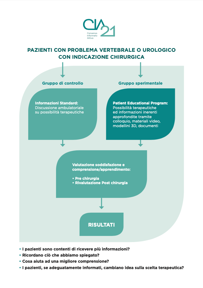Il programma prevede la creazione e l’uso di nuovi strumenti informativi per pazienti candidati a chirurgia complessa in ambito vertebrale e urologico. Tali strumenti (animazioni, modelli 3D, materiale multimediale, video, informazione elettronica fruibile localmente in ospedale o direttamente al domicilio del paziente) sono stati progettati “ad hoc” per informare in modo più efficace il paziente, migliorandone la comprensione, la soddisfazione e dunque l’adesione al percorso di cura, ottimizzando il tempo del personale sanitario e soprattutto il risultato terapeutico.